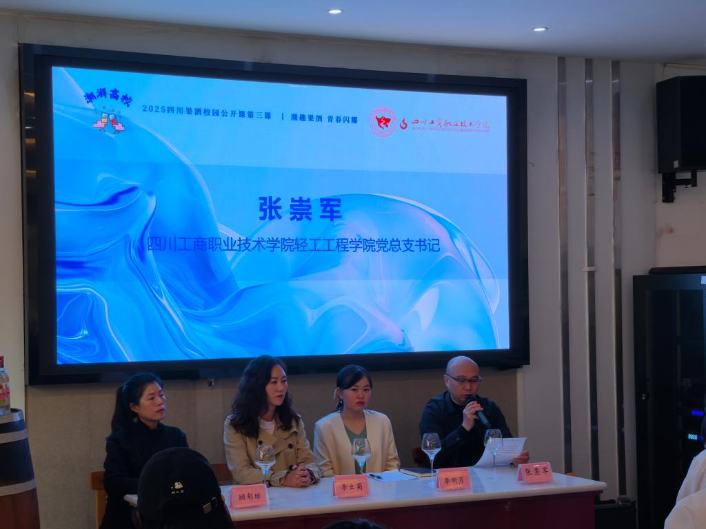 10月21日,以“潮趣果酒,青春闪耀”为主题的2025四川果酒校园公开课第三课在公司太阳成tyc7111cc实训楼品酒室成功举办。出席本次活动的嘉宾有四川省葡萄酒与果酒行业协会副秘书长顾彩琼、成都酒业集团有限公司副总经理李明月、九寨沟县九寨庄园葡萄酒业有限公司营销总监李幺菊。酿酒技术教研室全体教师到场听课,50名酿酒技术专业员工踊跃参与,共同开启了一场产教深度融合的果酒品鉴与学习之旅。活动深度融合产教融合理念,旨在通过行业专家进课堂、前沿产品品鉴等形式,为酿酒技术专业学子搭建起理论与市场、校园与产业的桥梁。