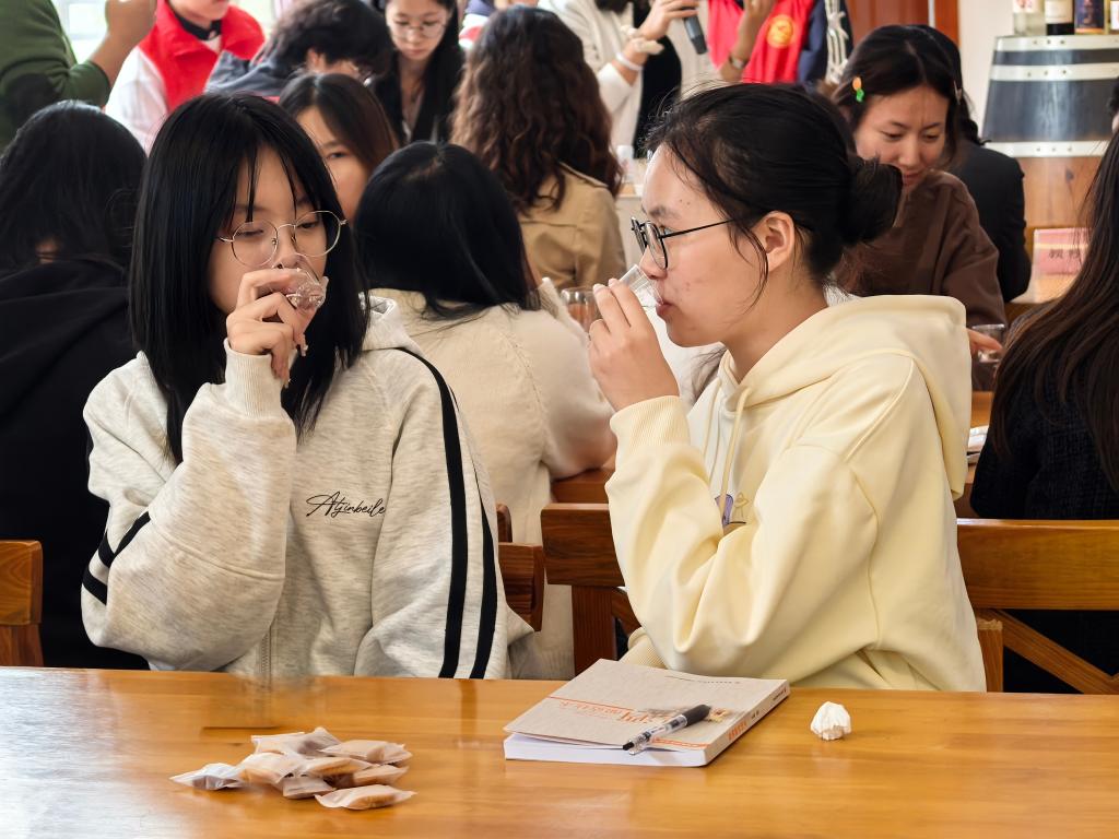 现场学习与实践氛围浓厚,理实结合是本次公开课的一大亮点。分享环节结束后,成都酒业集团有限公司与九寨沟县九寨庄园葡萄酒业有限公司带来了旗下多款特色产品员工品鉴。其中包括崃一口品牌的“合理冲撞”系列——创意十足的樱花白桃酒、咖啡荔枝酒、椒麻青梅酒,以及九寨庄园的优选级干红葡萄酒、水晶甜白葡萄酒和桃红葡萄酒。同学们在老师的指导和志愿者的帮助下,逐一品鉴,与企业专家和教师就酒品风味、酿造工艺等方面进行了深入交流,现场气氛热烈。