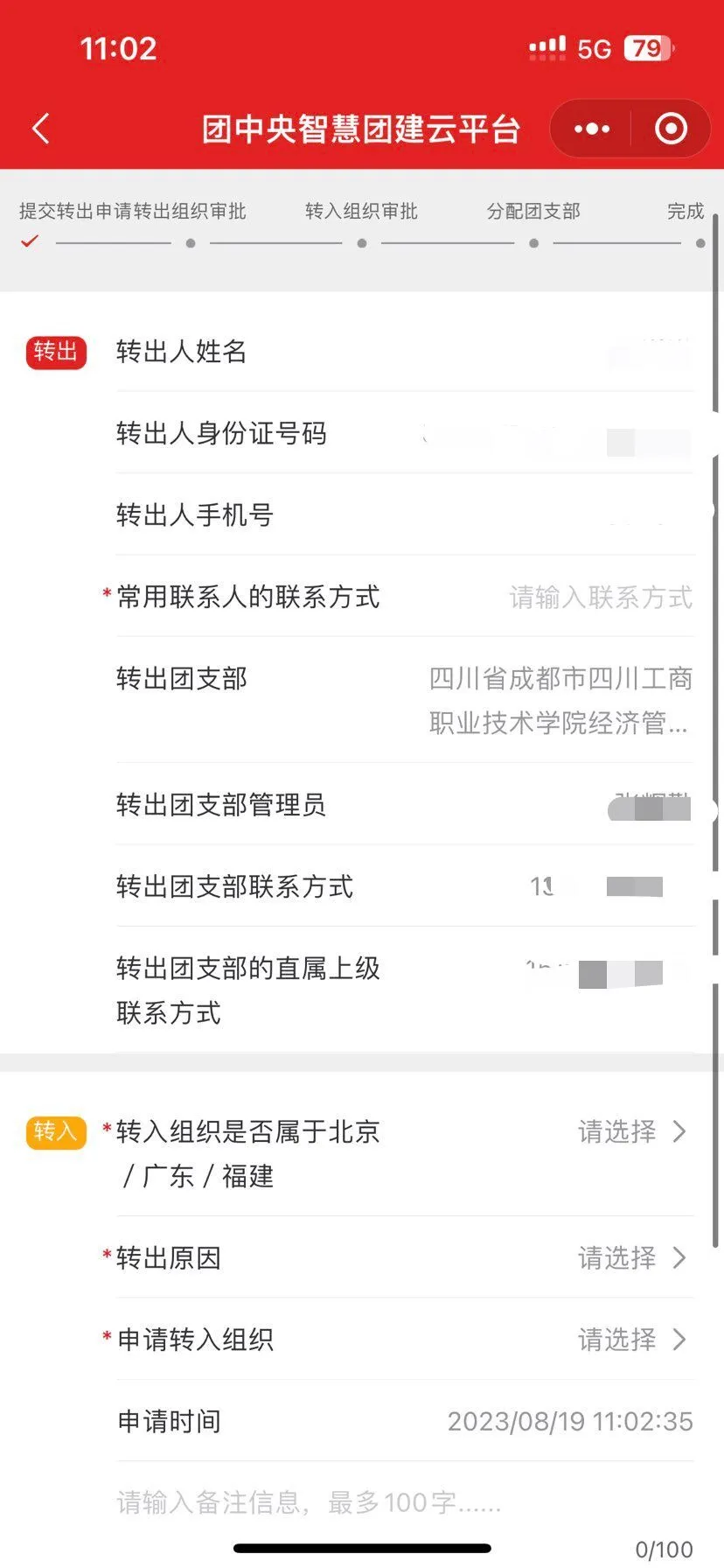 4、点击办理转出,选择转入组织、所在公司的临时团支部